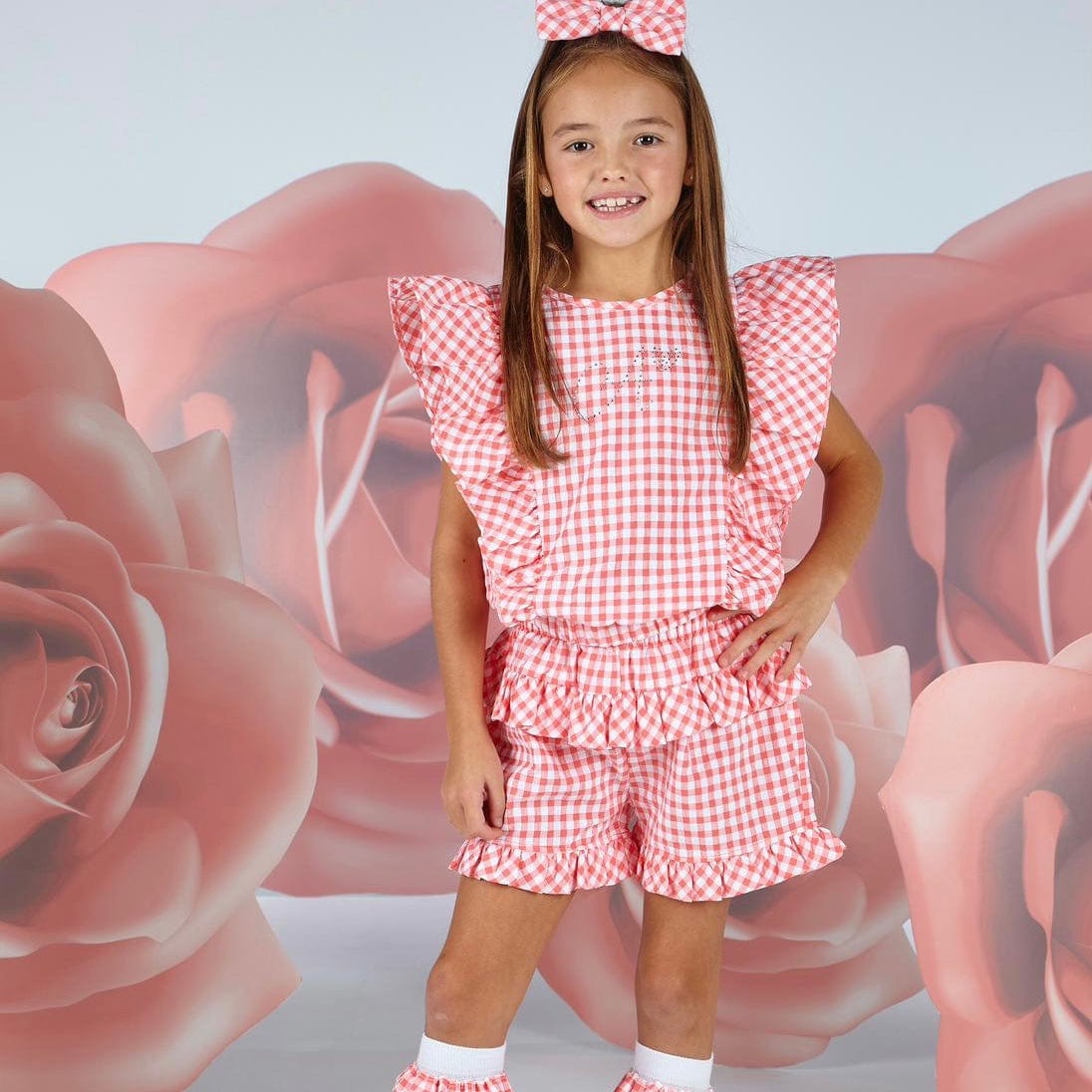 2 piece check short set with top featuring exaggerated shoulder frill detail and diamnate A*Dee on front paired with matching check shorts with frill detail.